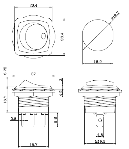Specifications ˙Circuit : A : ON-OFF B : ON-ON E : W/Round Len L : illuminated ˙Rating : 10A 125VAC/250VAC ˙Contact Resistance : 30mΩ(max.) ˙Insulation Resistance : DC 500V 100MΩ(min.) ˙Dielectric Strength : AC 1000V 1 Minute ˙Operation Force : 800±300g ˙Operation Life : 10000 Cycle at Full Load ˙Operation Temperature Range : -25℃~+85℃ ˙Soldering Heat Temperature : 280℃ 3 Sec |